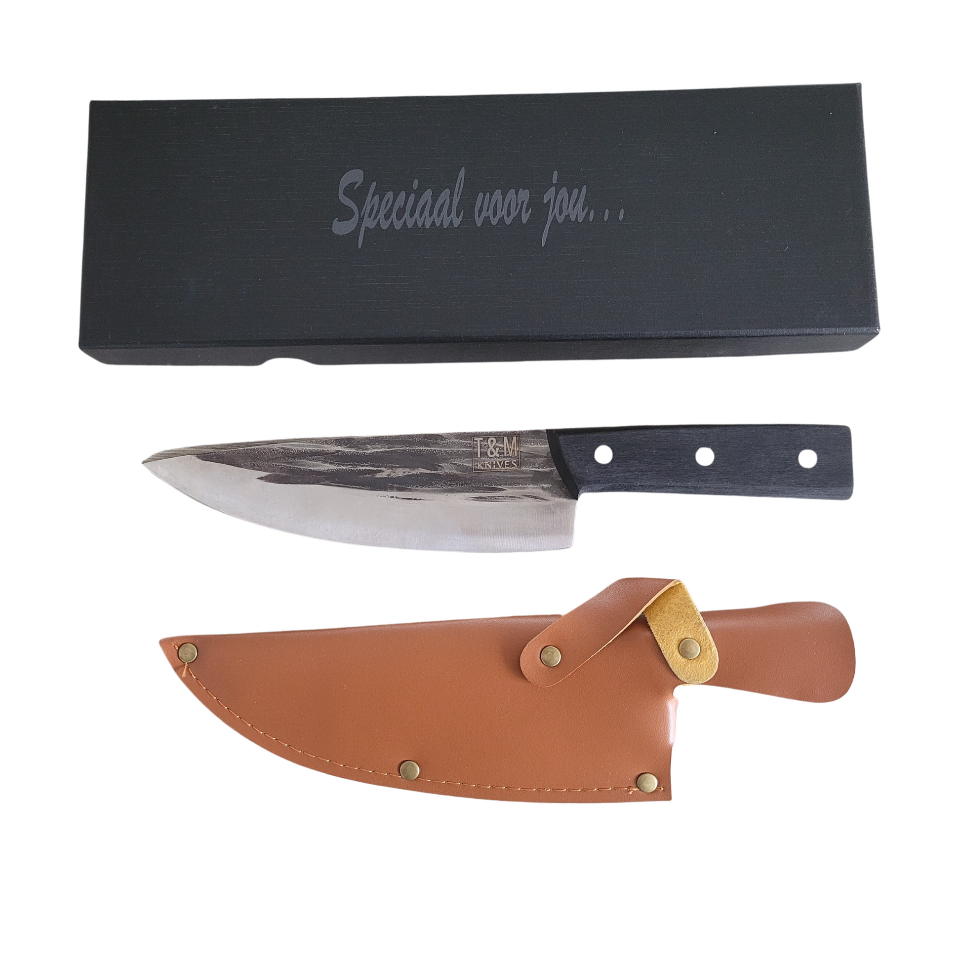 Dieses robuste Messer ist größtenteils handgefertigt und gefertigt Auf traditionelle Weise geschmiedet , wodurch das wunderschöne, einzigartige Design des Messers entsteht. Das Kochmesser besteht aus steinhartem Stahl . Der Griff besteht aus schönem, charakteristischem, nachhaltigem Holz.
